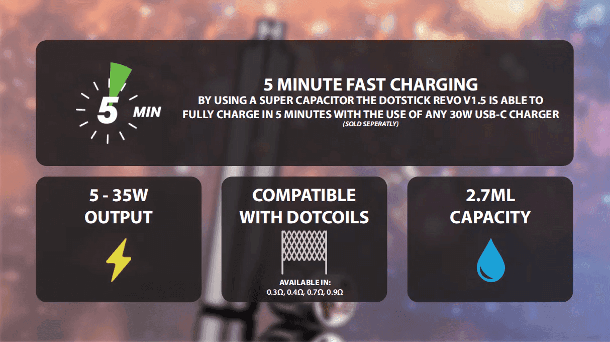 • 兼容所有0.3Ω或更高的dotCoils(dotAIO V2和dotTank 25mm)
